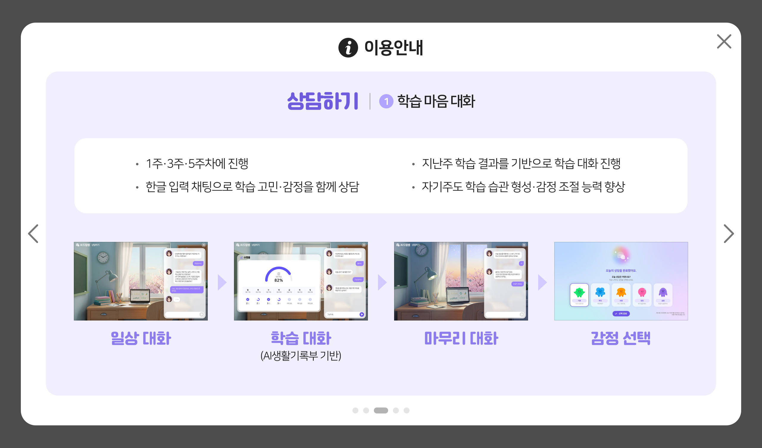 학부모 공유: 상담 결과 요약본은 학부모님과 담당 교사에게도 전달되어, 자녀의 학습 상태와 심리 변화를 긴밀하게 확인하실 수 있습니다.