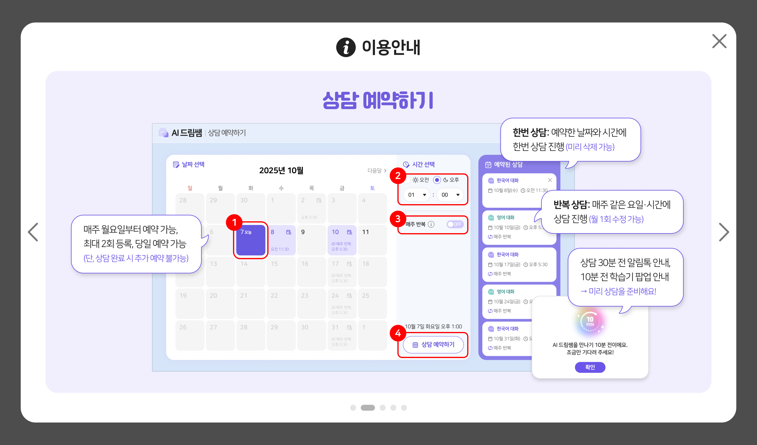 편리한 예약: 매주 요일과 시간을 지정하는 '반복 상담' 또는 필요할 때 예약하는 '한번 상담' 중 선택할 수 있습니다.