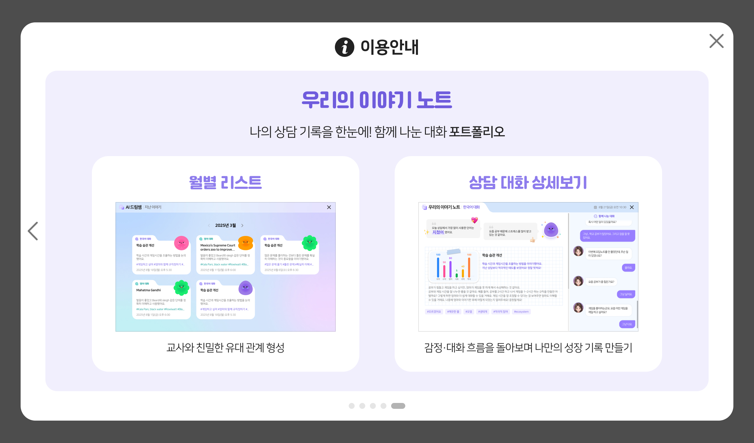 우리의 이야기: 상담 완료 후 대화 전문과 요약본이 제공되어 아이가 스스로 상담 내용을 복기할 수 있습니다.